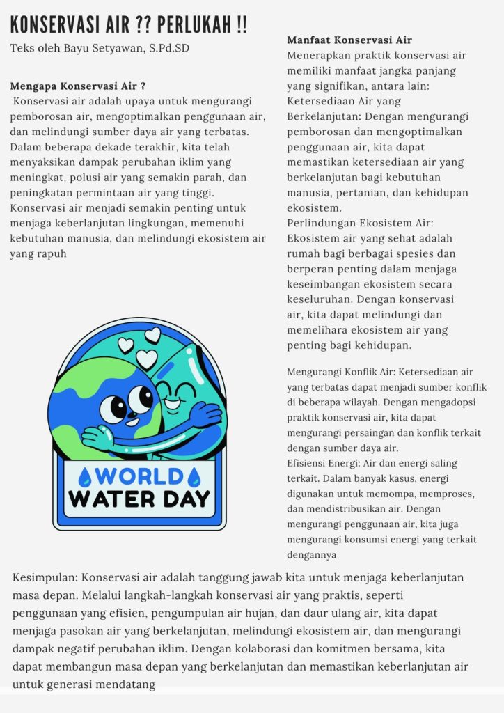Artikel yang ditulis oleh bapak bayu setyawan, S.Pd.SD berkaitan dengan pentingnya konservasi air sebagai inisiatif kita sebagai manusia yang sangat bergantung kepada air.Sebagian besar tubuh manusia terdiri dari air. Persentase kandungan air dalam tubuh bervariasi tergantung pada usia, jenis kelamin, dan komposisi tubuh individuTujuan konservasi air adalah untuk melindungi sumber daya air yang terbatas dan […]